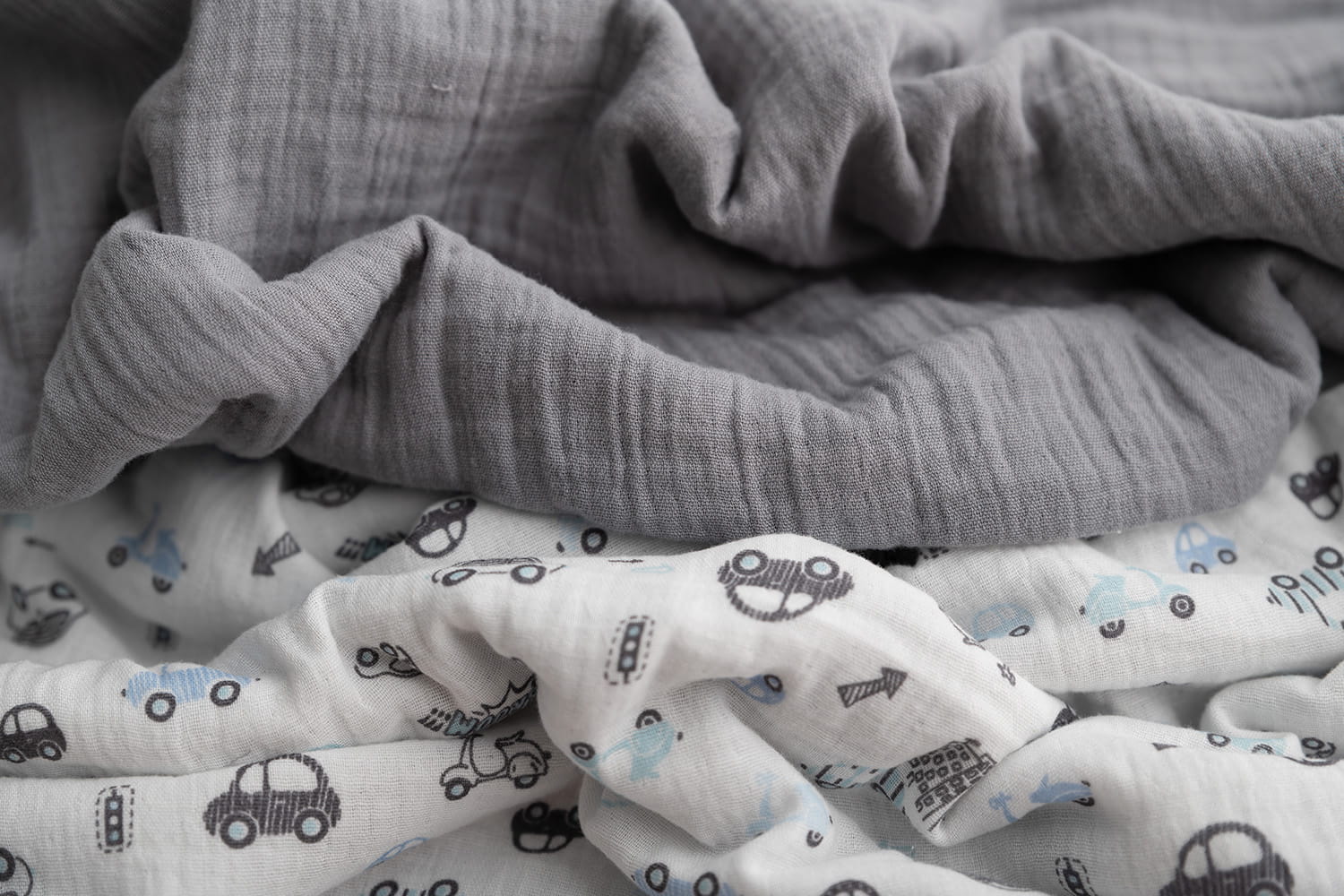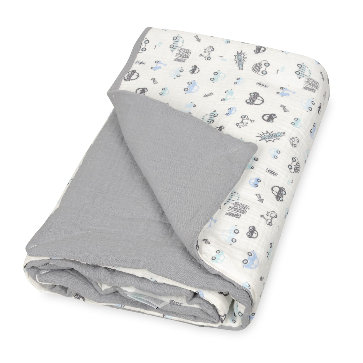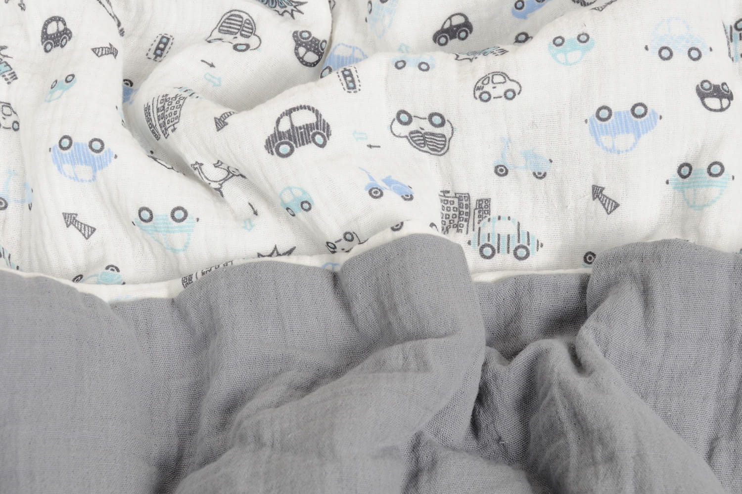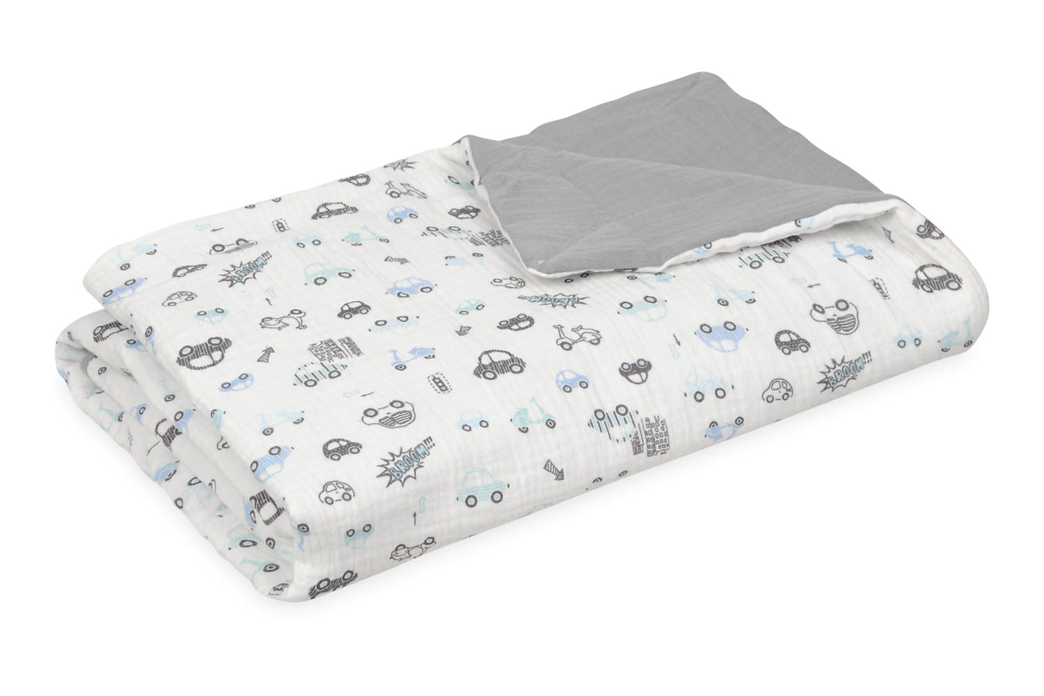 Kocyk 75x100 Muślin Design jasnoszary + biały w autka w pudełku BabyMatex