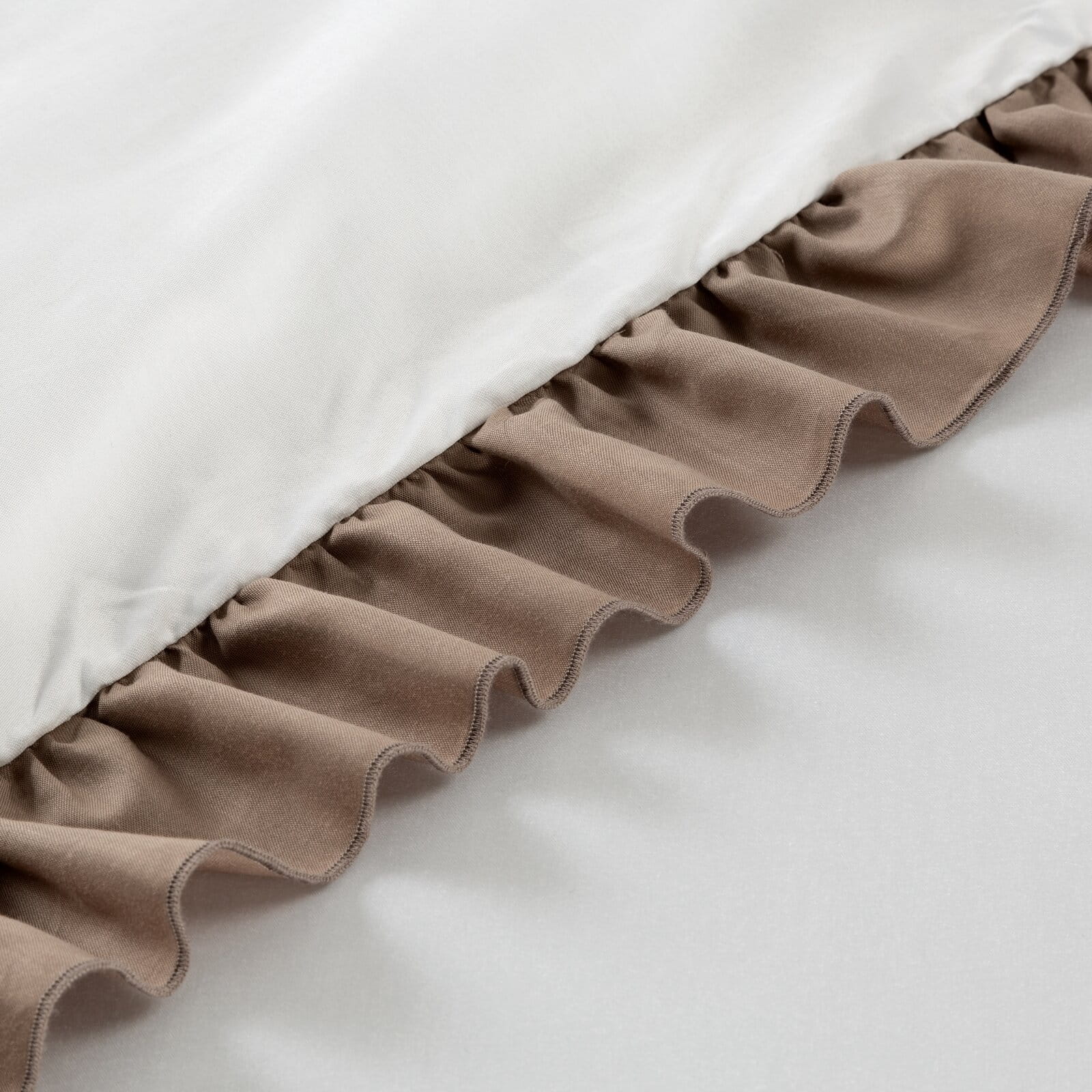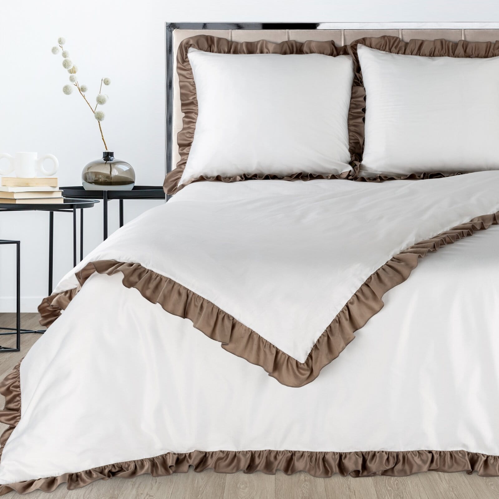 Biała pościel 220x200 satynowa Eliza z jasnobrązowymi falbanami Eurofirany