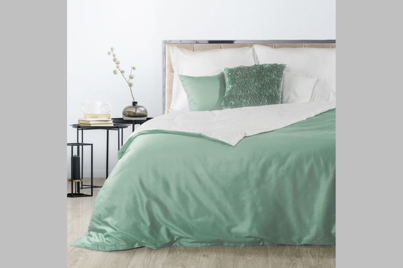 Komplet dwustronnej pościeli biało-miętowej w rozmiarze 220x200 cm, wykonanej z miękkiej satyny bawełnianej.