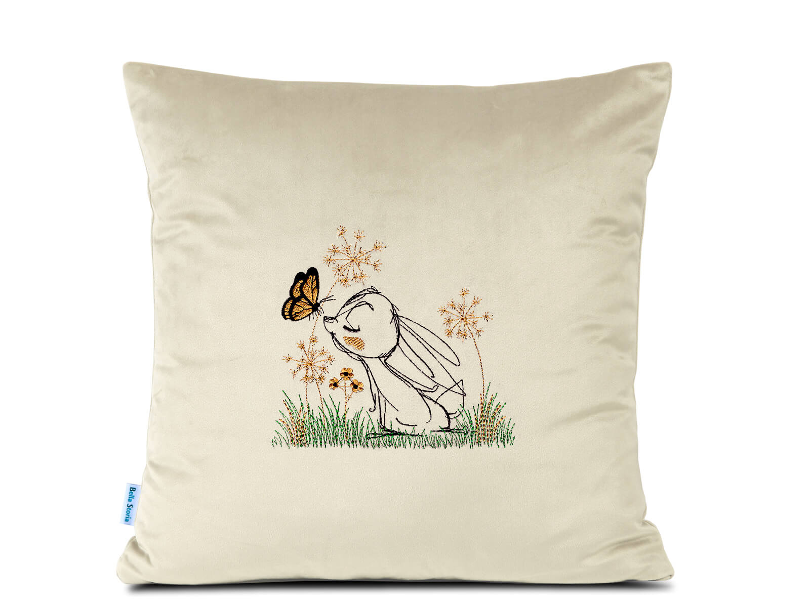 Haftowana poduszka dekoracyjna z uroczym zajączkiem znajdującym się na wiosennej polanie w otoczeniu motylka. Poduszka wykonana została z subtelnej, miękkiej i delikatnej tkaniny welwetowej w kolorze kremowym.
