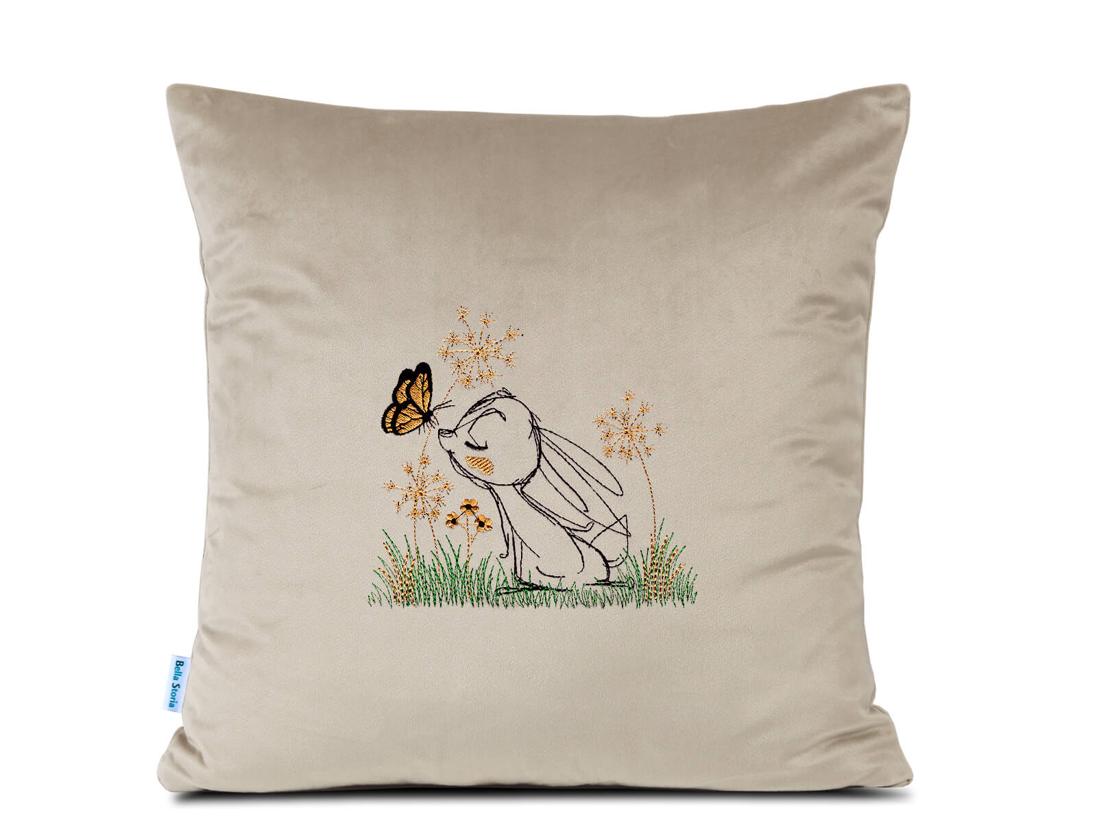 Haftowana poduszka dekoracyjna z uroczym zajączkiem znajdującym się na wiosennej polanie w otoczeniu motylka. Poduszka wykonana została z subtelnej, miękkiej i delikatnej tkaniny welwetowej w kolorze szarobeżowym.
