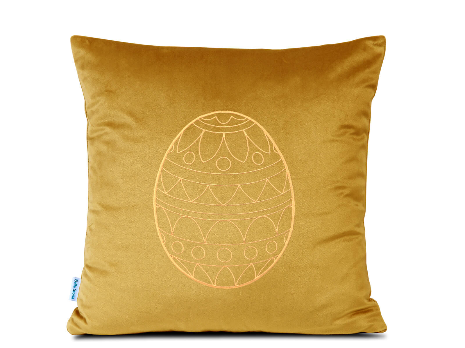Haftowana poduszka dekoracyjna ze złotym jajkiem wielkanocnym. Wykonana została z subtelnej, miękkiej i delikatnej tkaniny welwetowej w kolorze musztardowym.