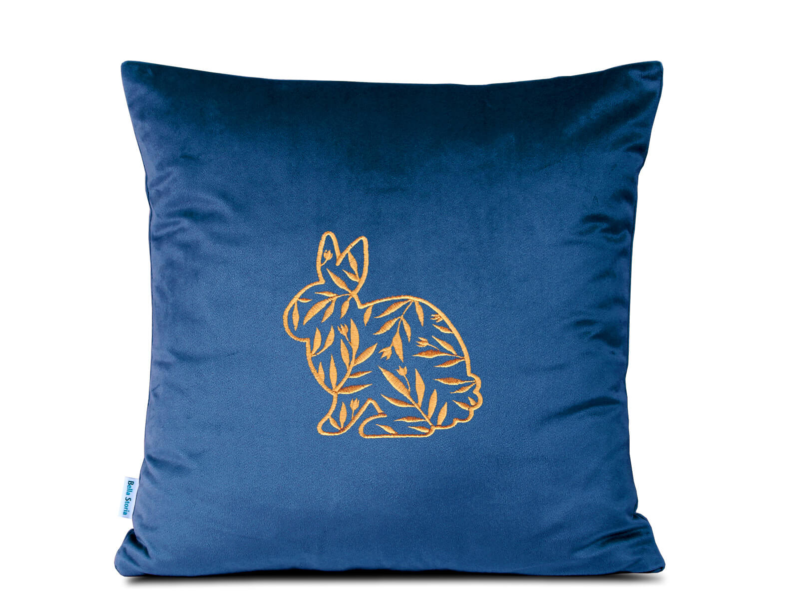 Haftowana poduszka dekoracyjna ze złotymi konturami zajączka i wypełnieniem w liście. Poduszka wykonana została z subtelnej, miękkiej i delikatnej tkaniny welwetowej w kolorze ciemnoniebieskim.