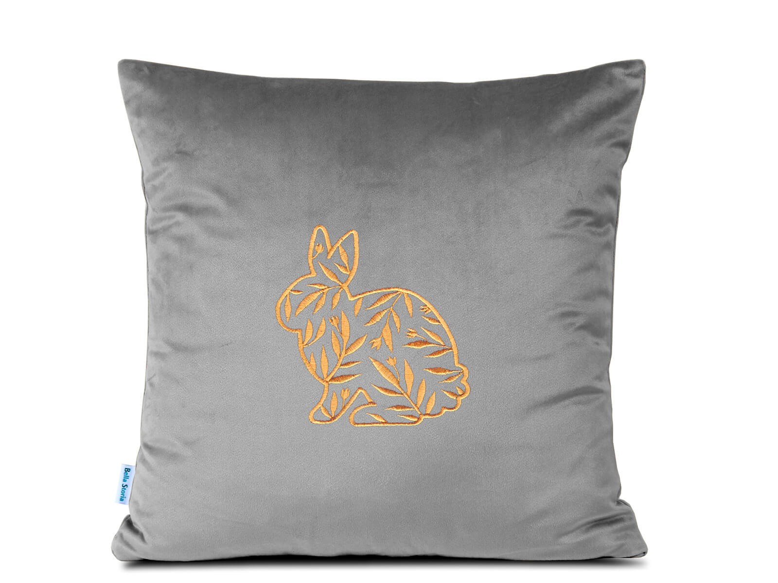 Haftowana poduszka dekoracyjna ze złotymi konturami zajączka i wypełnieniem w liście. Poduszka wykonana została z subtelnej, miękkiej i delikatnej tkaniny welwetowej w kolorze popielatym.