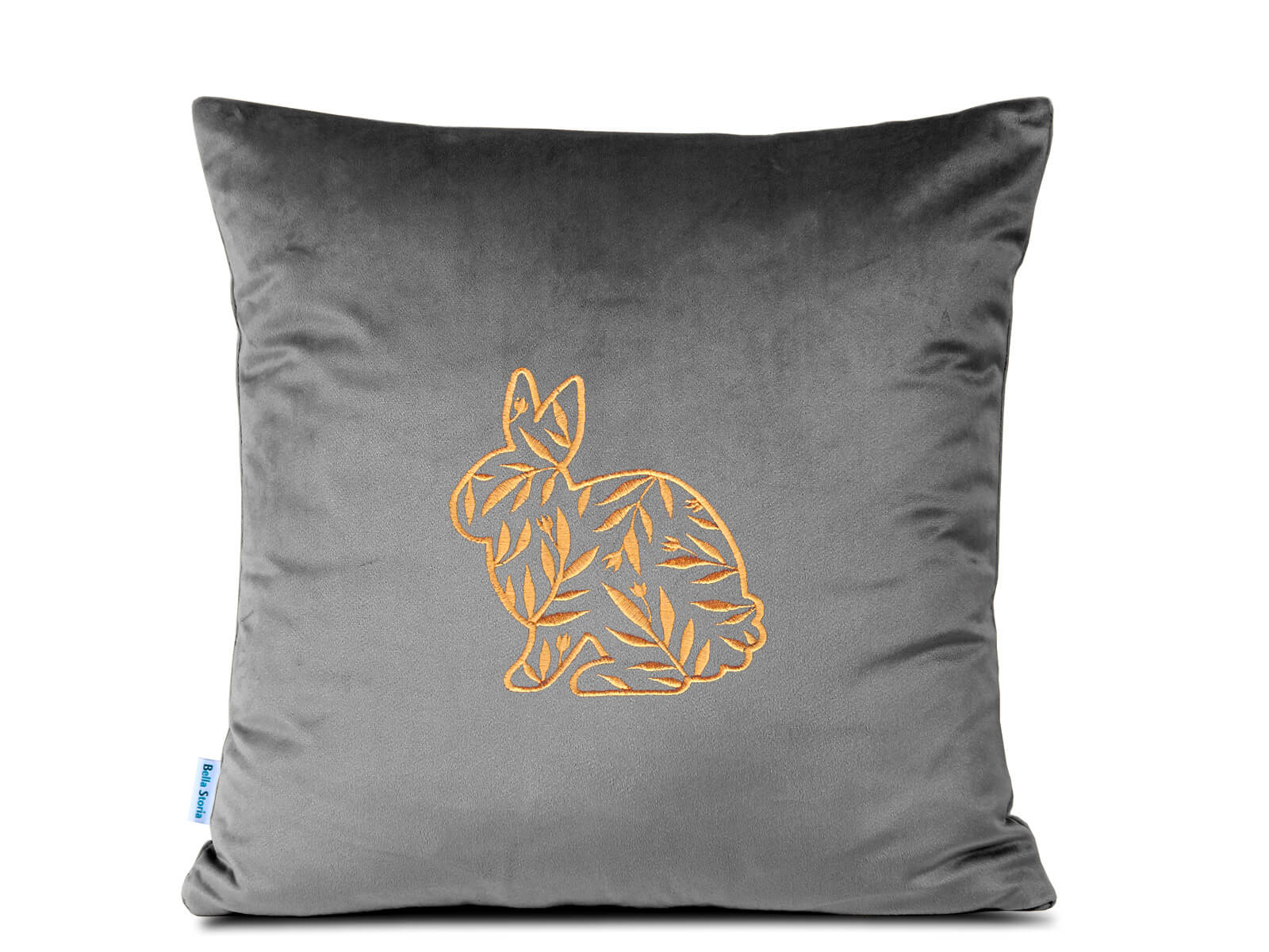 Haftowana poduszka dekoracyjna ze złotymi konturami zajączka i wypełnieniem w liście. Poduszka wykonana została z subtelnej, miękkiej i delikatnej tkaniny welwetowej w kolorze szarym.