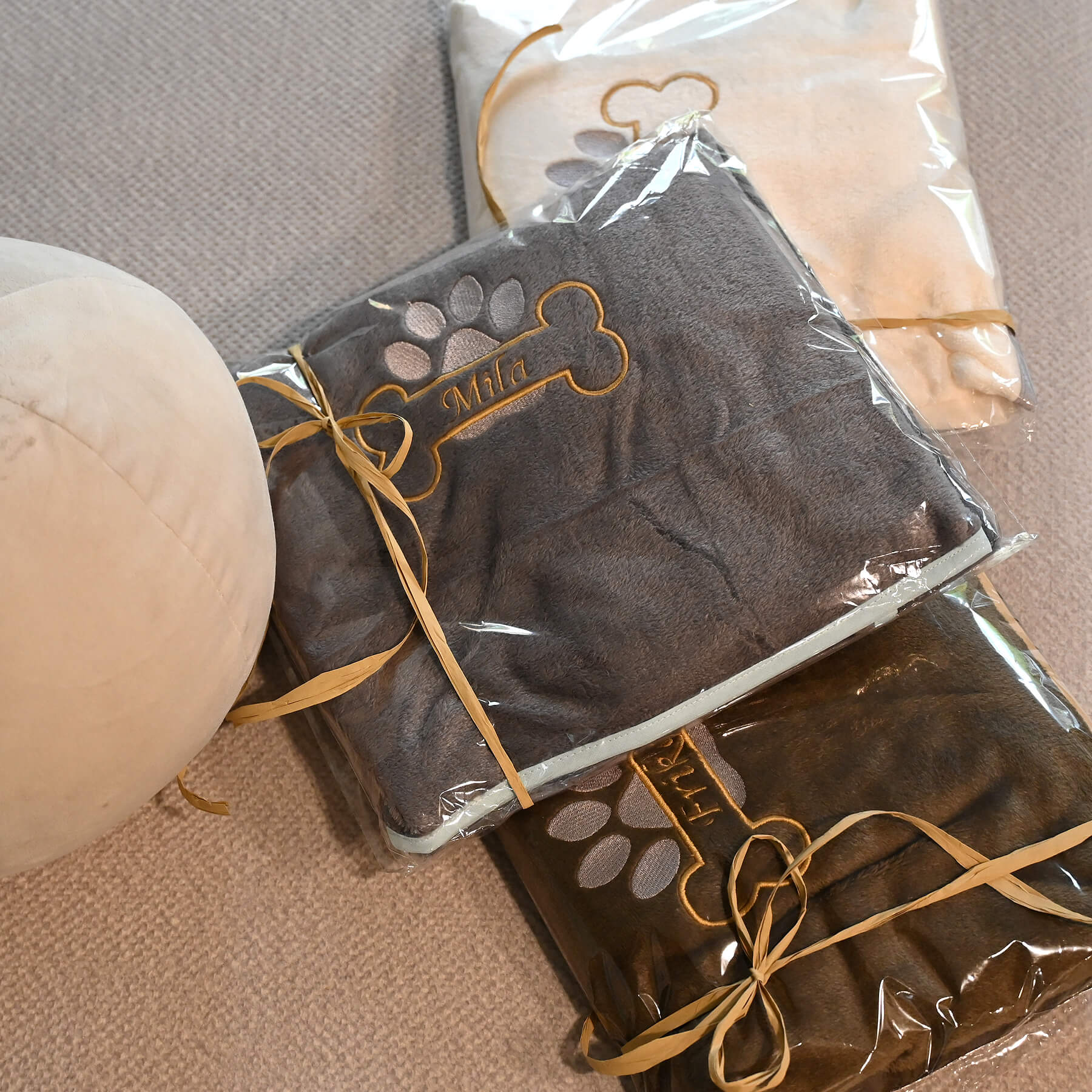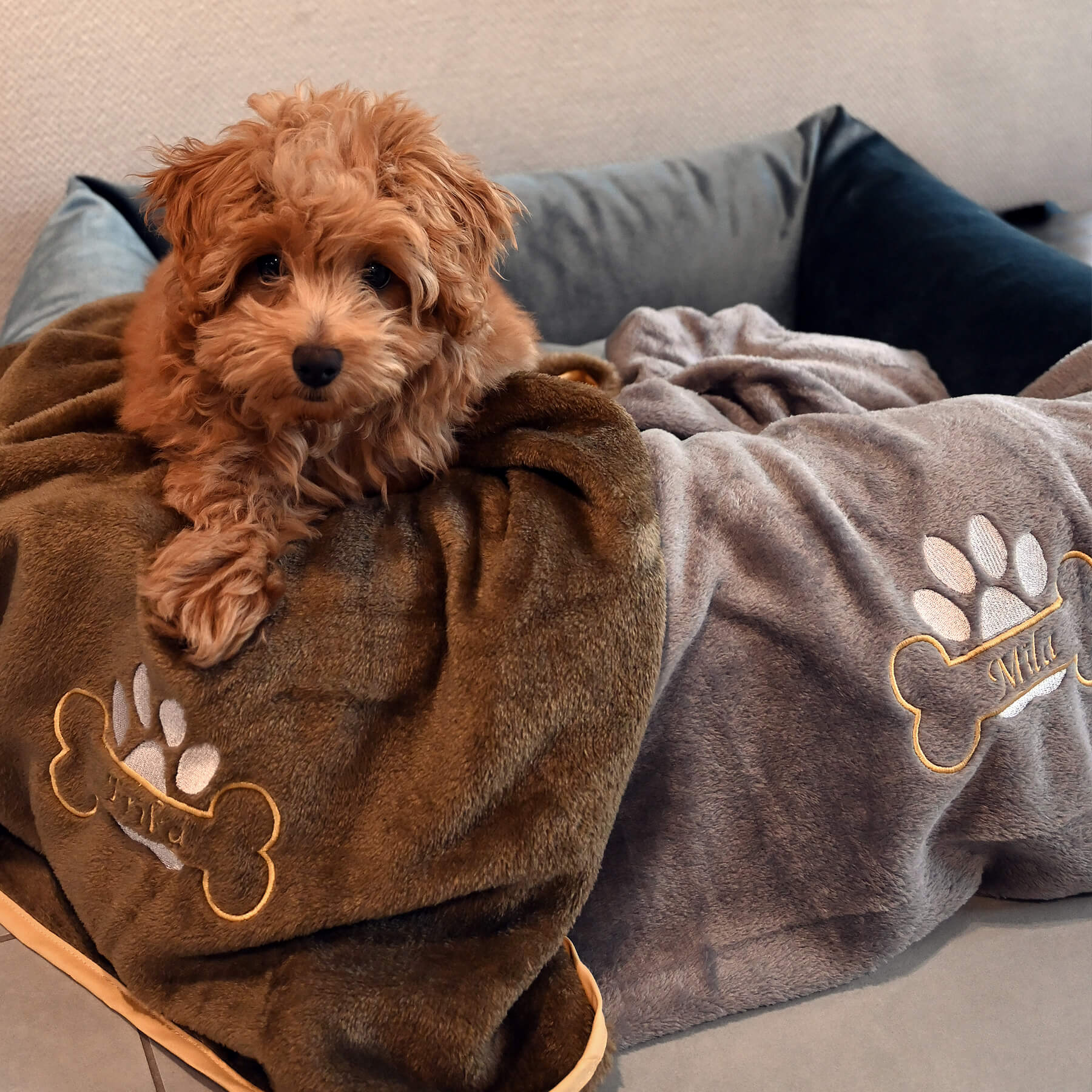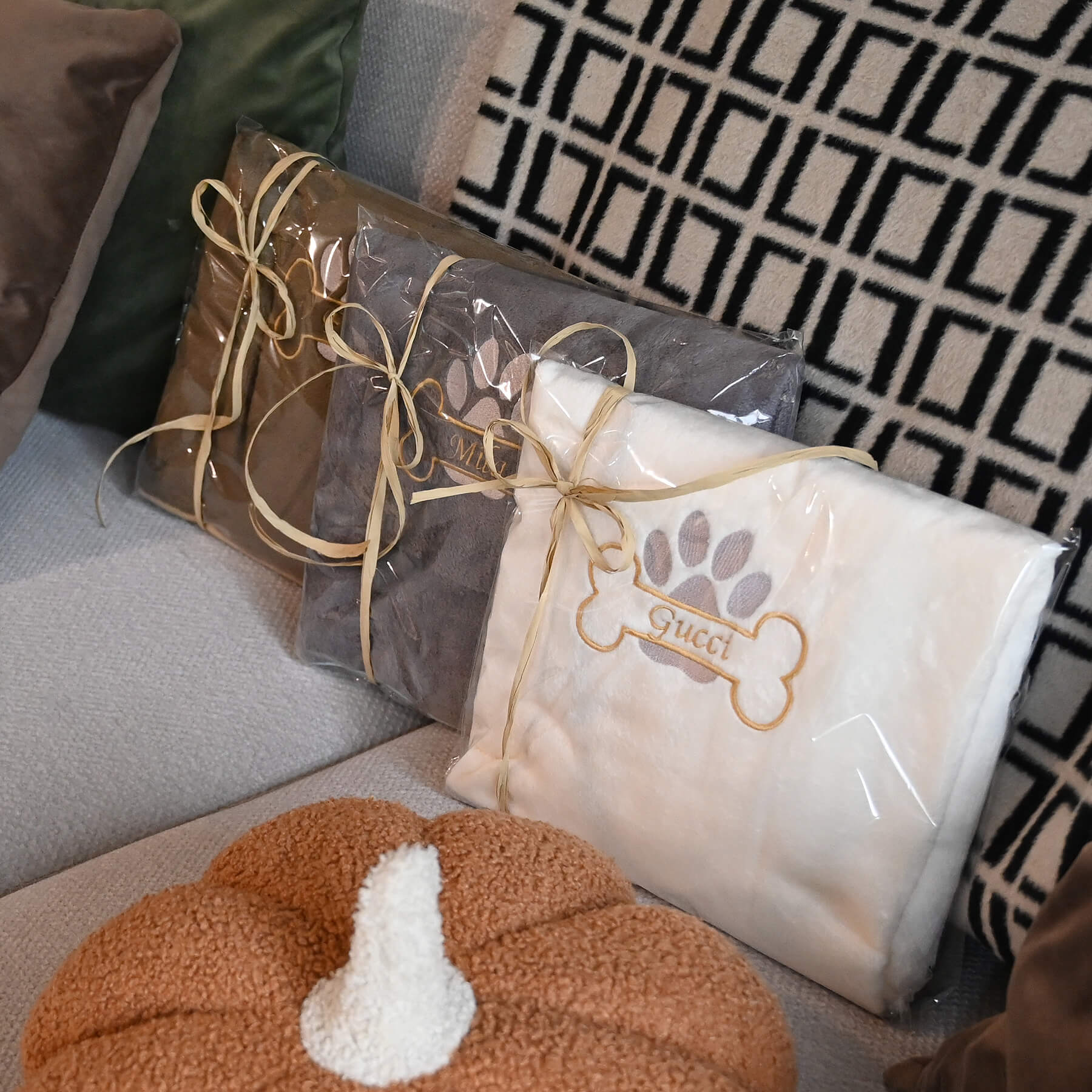 Wyhaftujemy imię Twojego psa w kolorze złotym, obok którego pojawi się złota kostka i srebrna łapka – subtelny, elegancki detal, który pięknie mieni się w świetle. To nie tylko koc – to symbol więzi, bliskości i czułości, jaką dzielisz ze swoim pupilem.