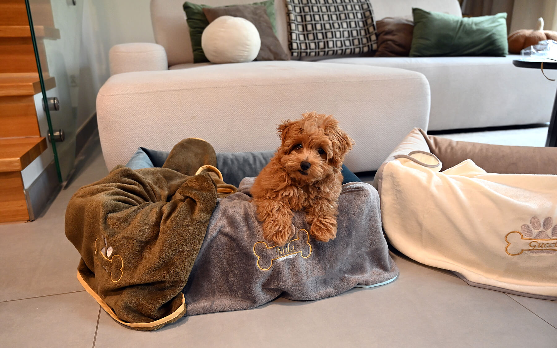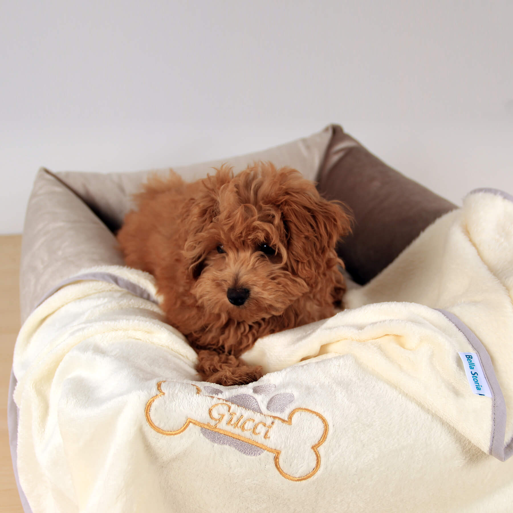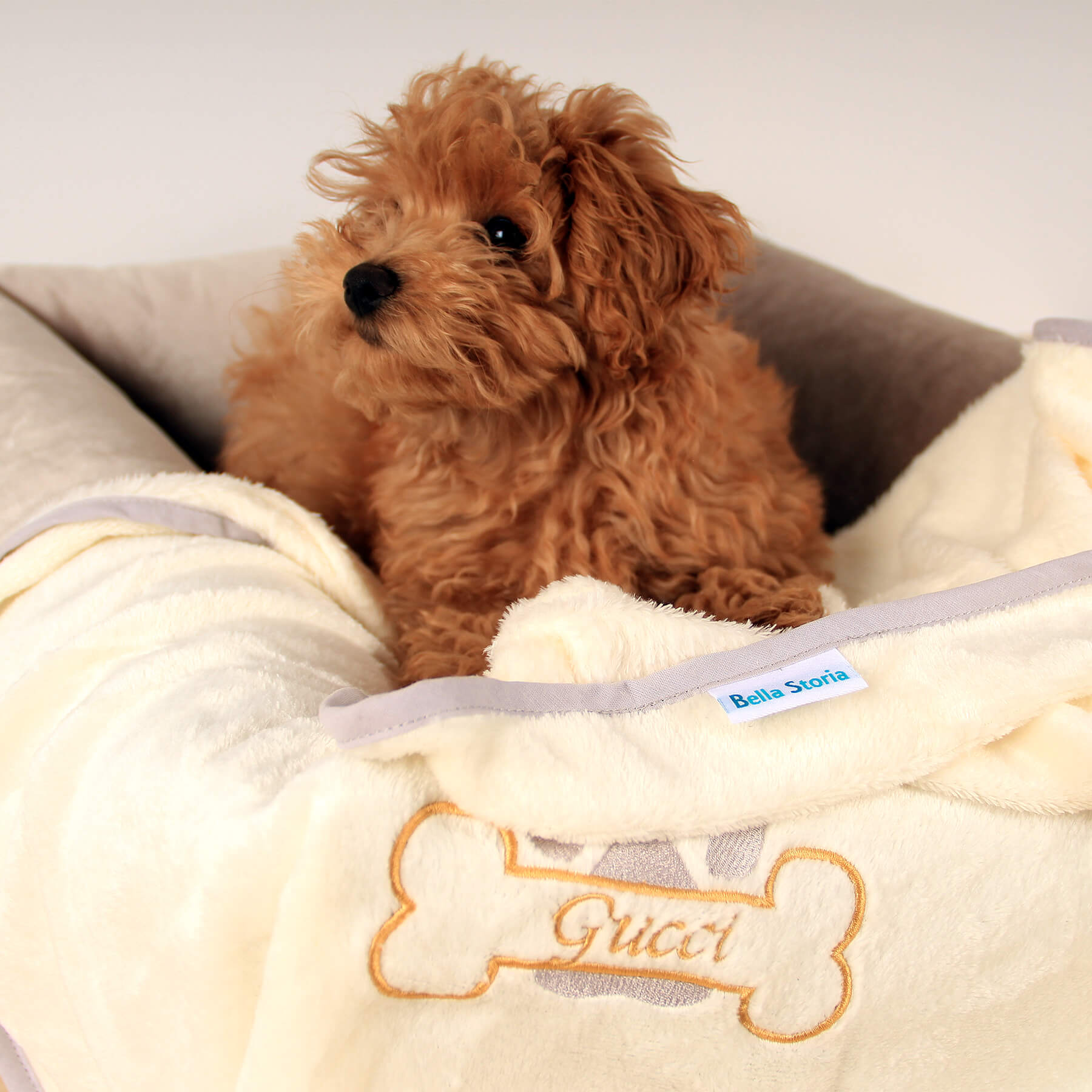 KOC DLA PSA AMICO Z HAFTOWANYM IMIENIEM PERSONALIZOWANY – KREMOWY Z SZARĄ LAMÓWKĄ
