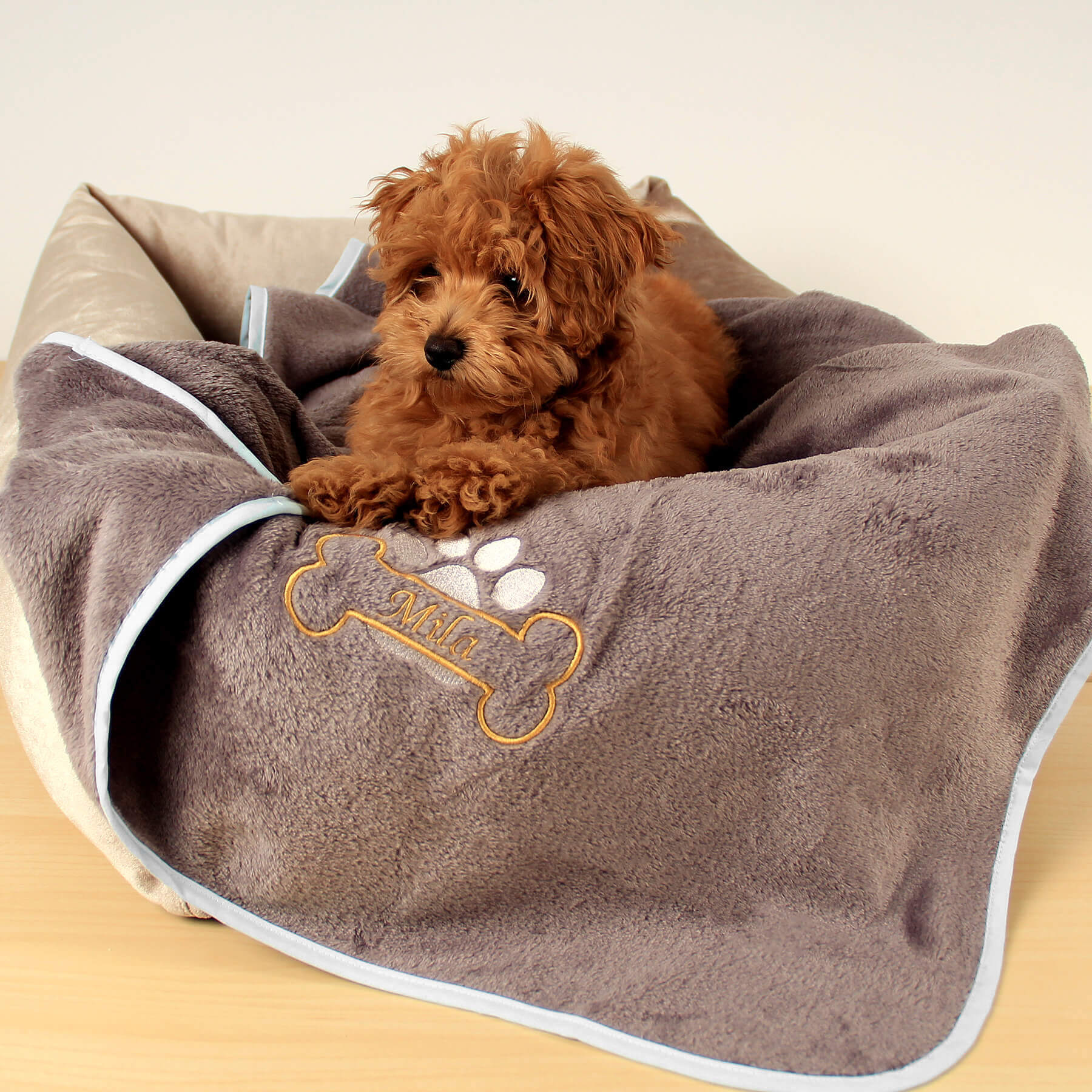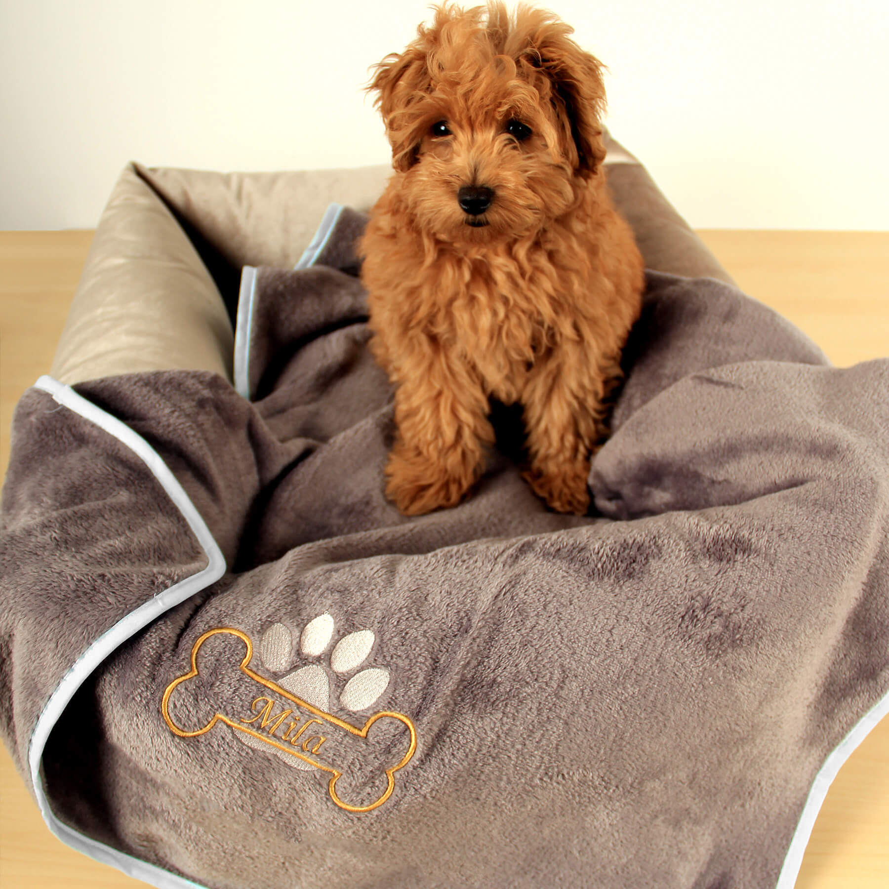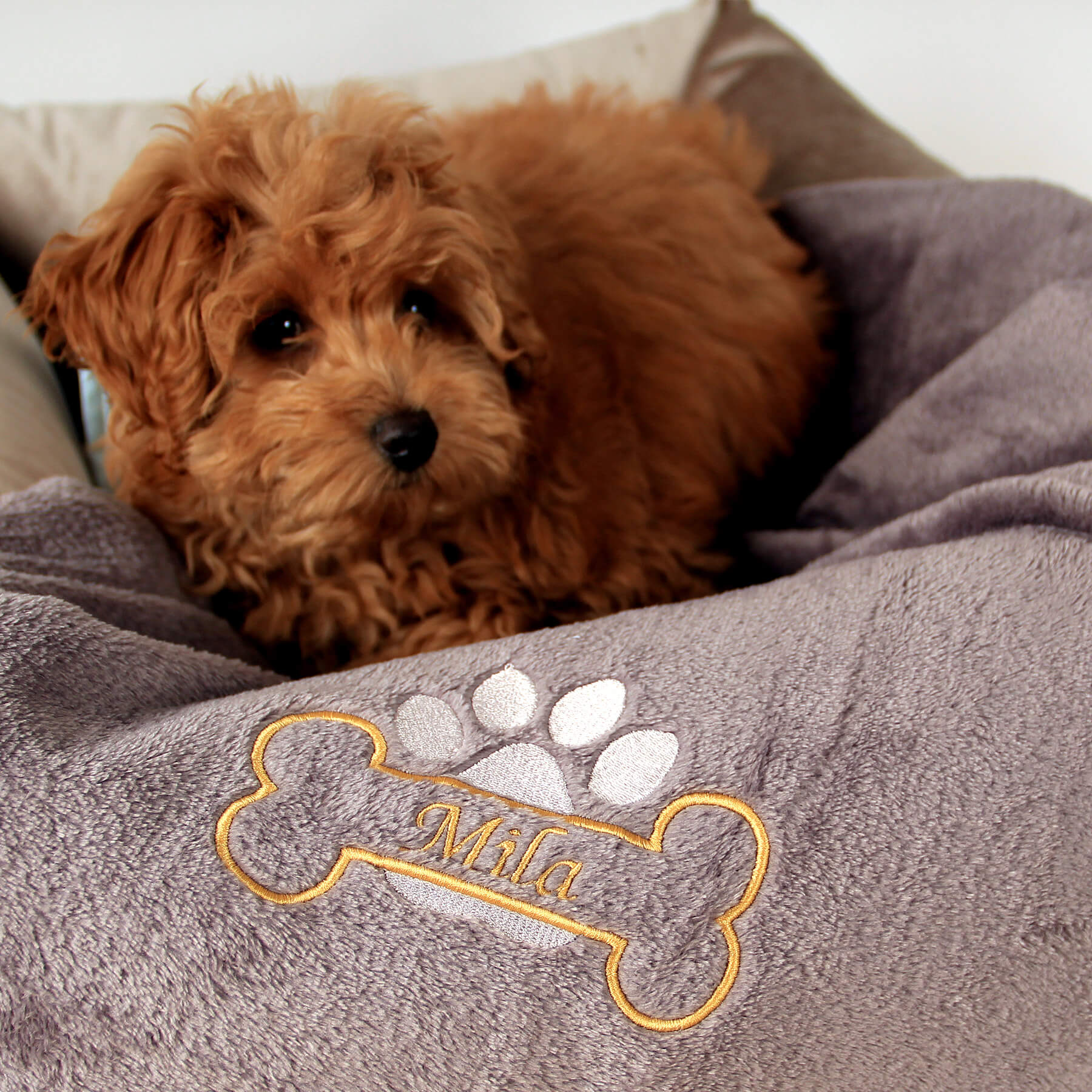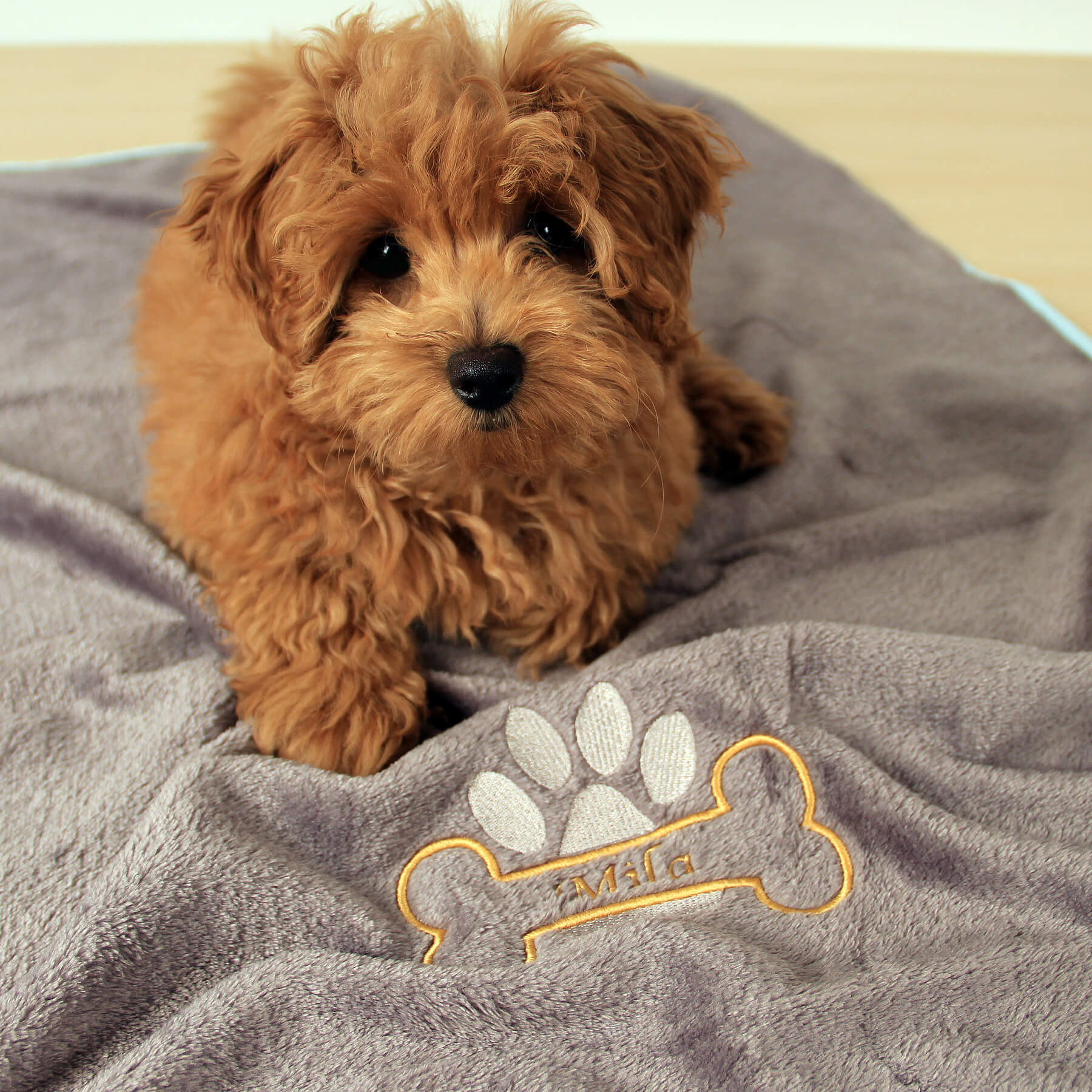 Każdy koc Amico jest wyjątkowy, tak jak jego właściciel. Wyhaftujemy imię Twojego psa w szlachetnym kolorze złotym, obok którego pojawi się złota kostka i srebrna łapka – delikatny błysk, który podkreśla indywidualność Twojego pupila. To detal, który przyciąga wzrok i czyni koc pamiątką o osobistym znaczeniu – pełną ciepła i klasy.
