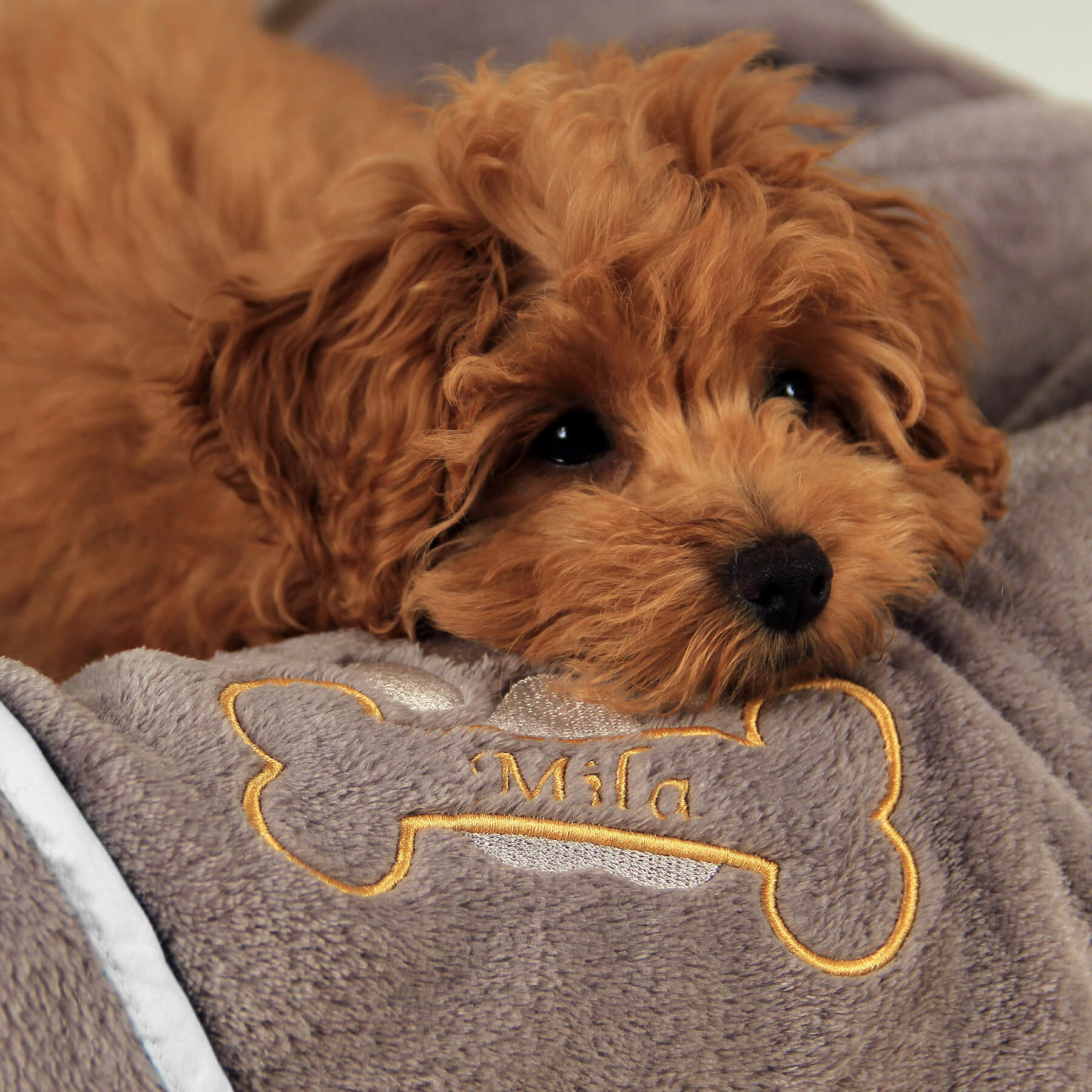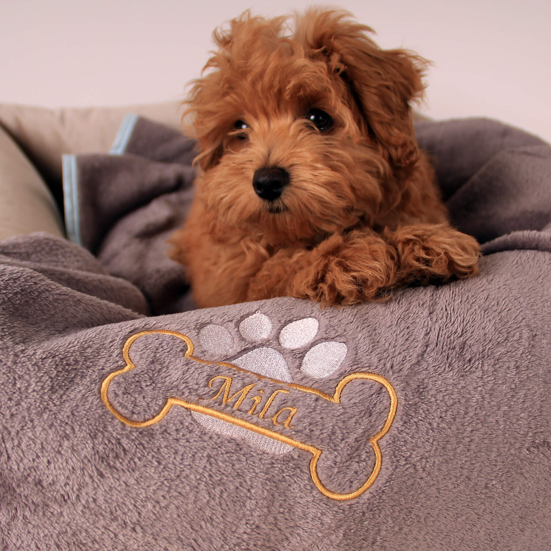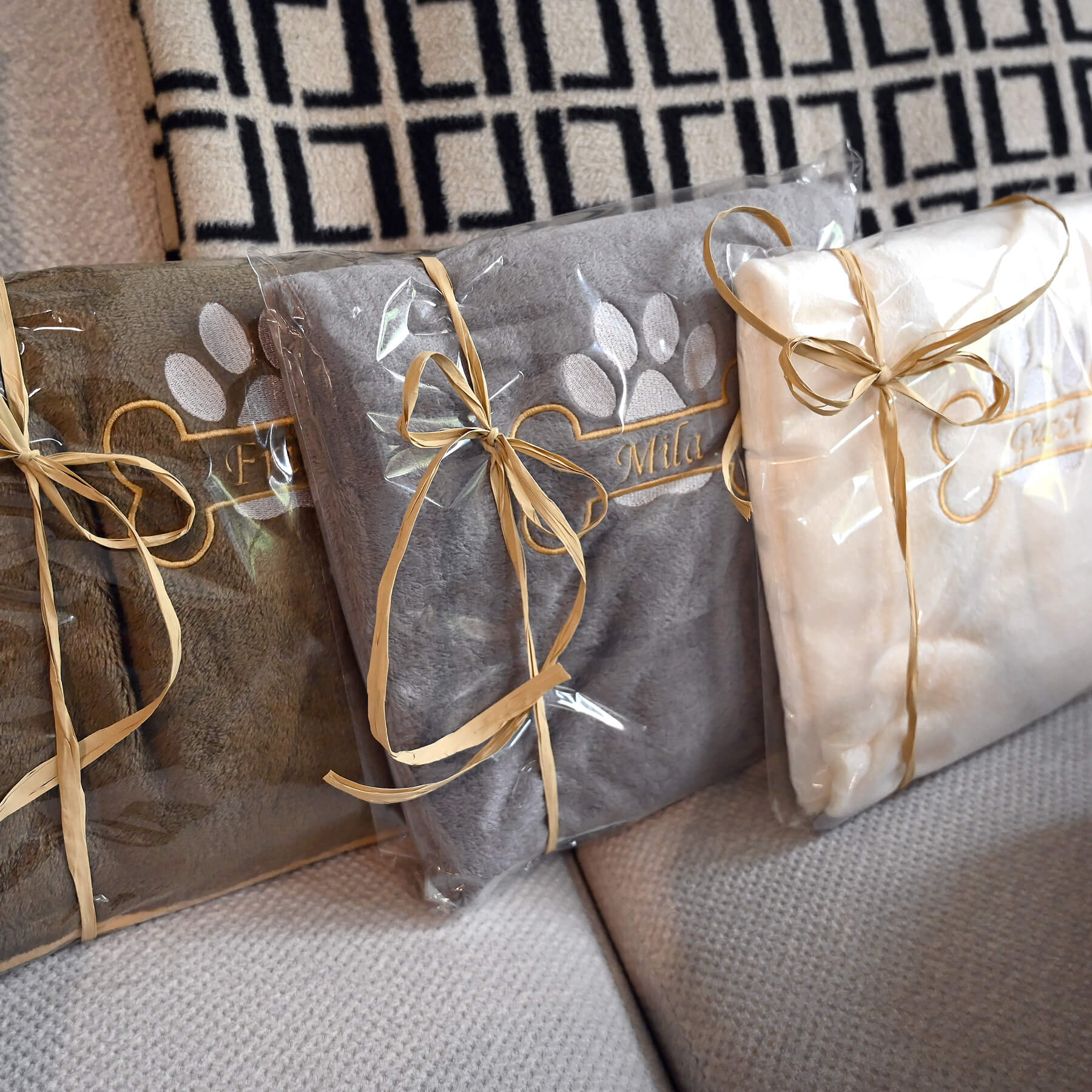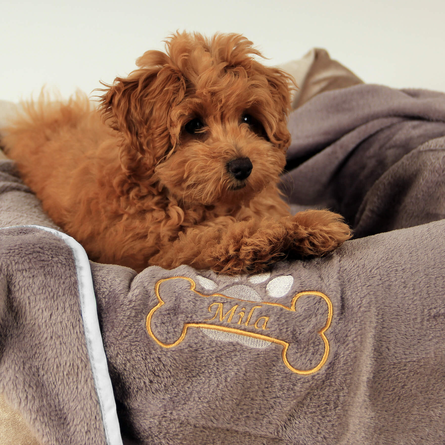 Każdy koc Amico jest wyjątkowy, tak jak jego właściciel. Wyhaftujemy imię Twojego psa w szlachetnym kolorze złotym, obok którego pojawi się złota kostka i srebrna łapka – delikatny błysk, który podkreśla indywidualność Twojego pupila. To detal, który przyciąga wzrok i czyni koc pamiątką o osobistym znaczeniu – pełną ciepła i klasy.