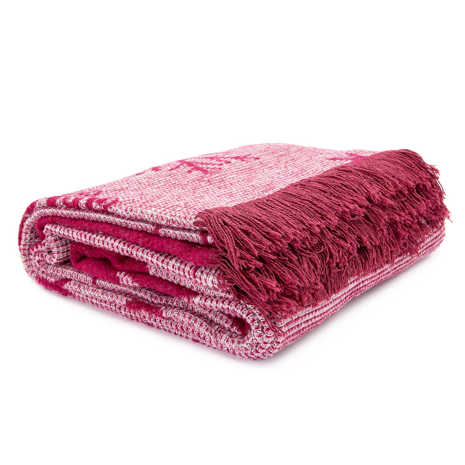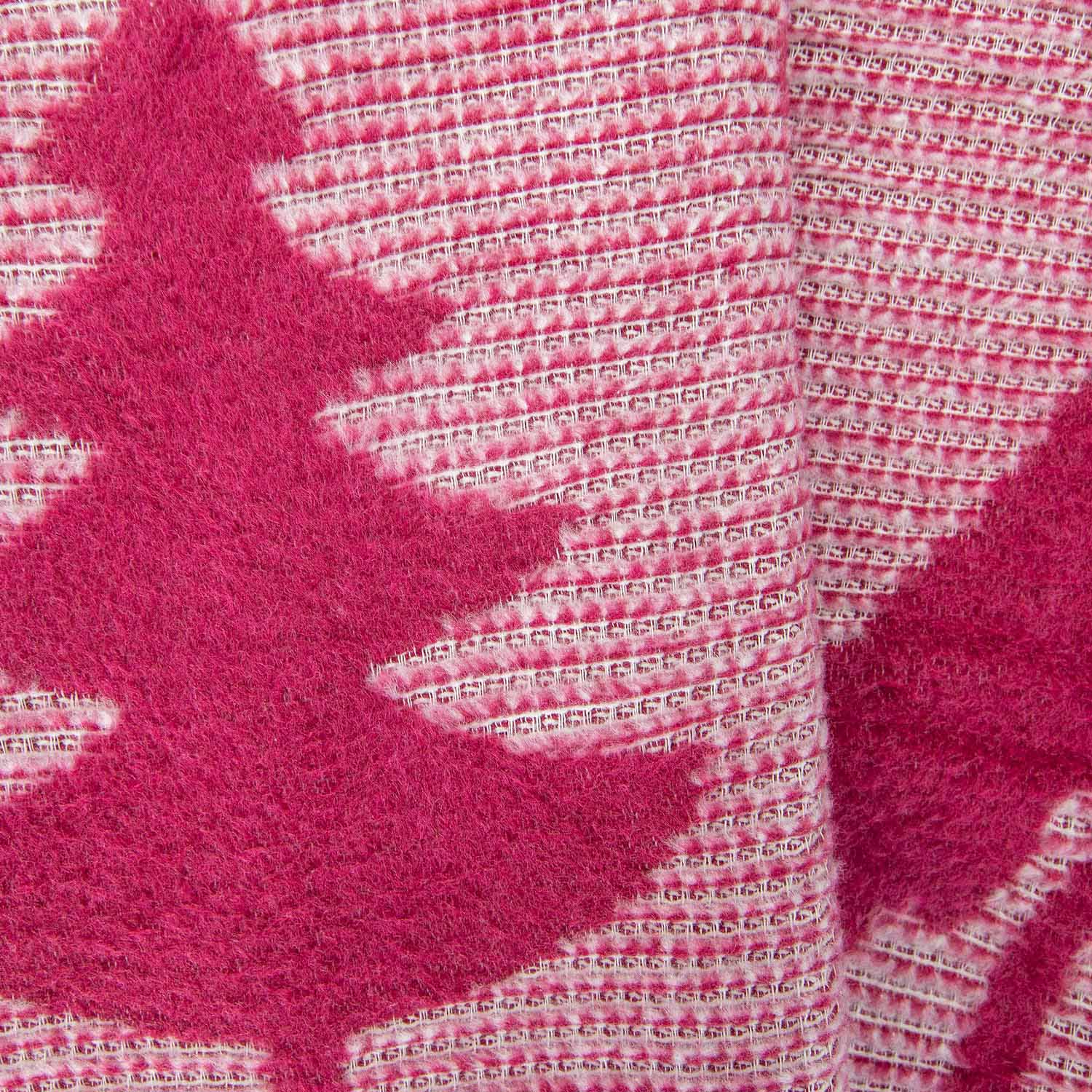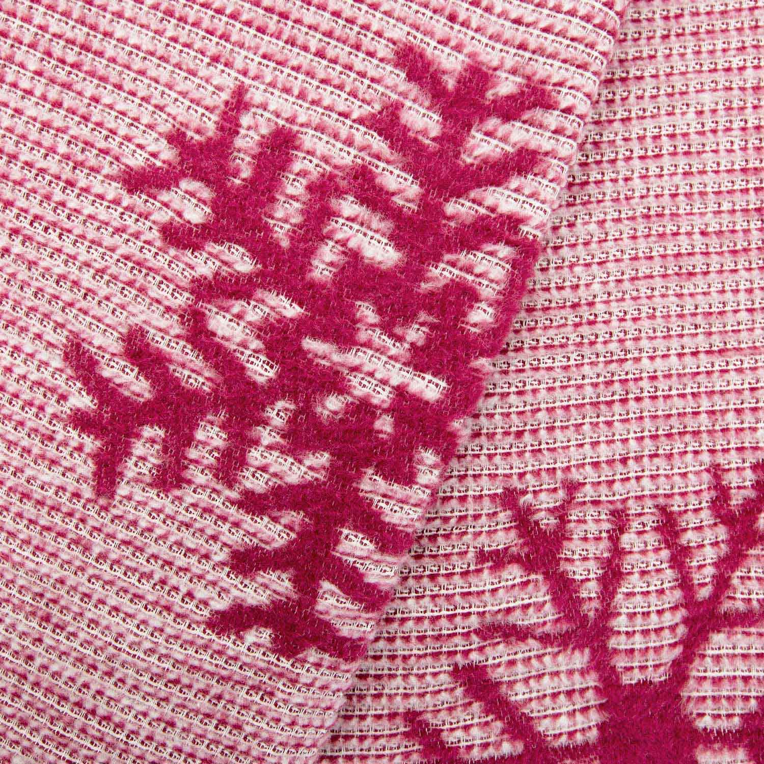 Wykonany z wysokogatunkowej przędzy – 58% bawełny, 32% akrylu i 10% poliestru – łączy w sobie miękkość, trwałość i wyjątkowy komfort użytkowania. Gramatura 450 g/m² gwarantuje przyjemne ciepło, a jednocześnie lekkość i przewiewność. Subtelne frędzle w dopasowanym malinowym odcieniu dodają całości elegancji i podkreślają staranność wykonania.