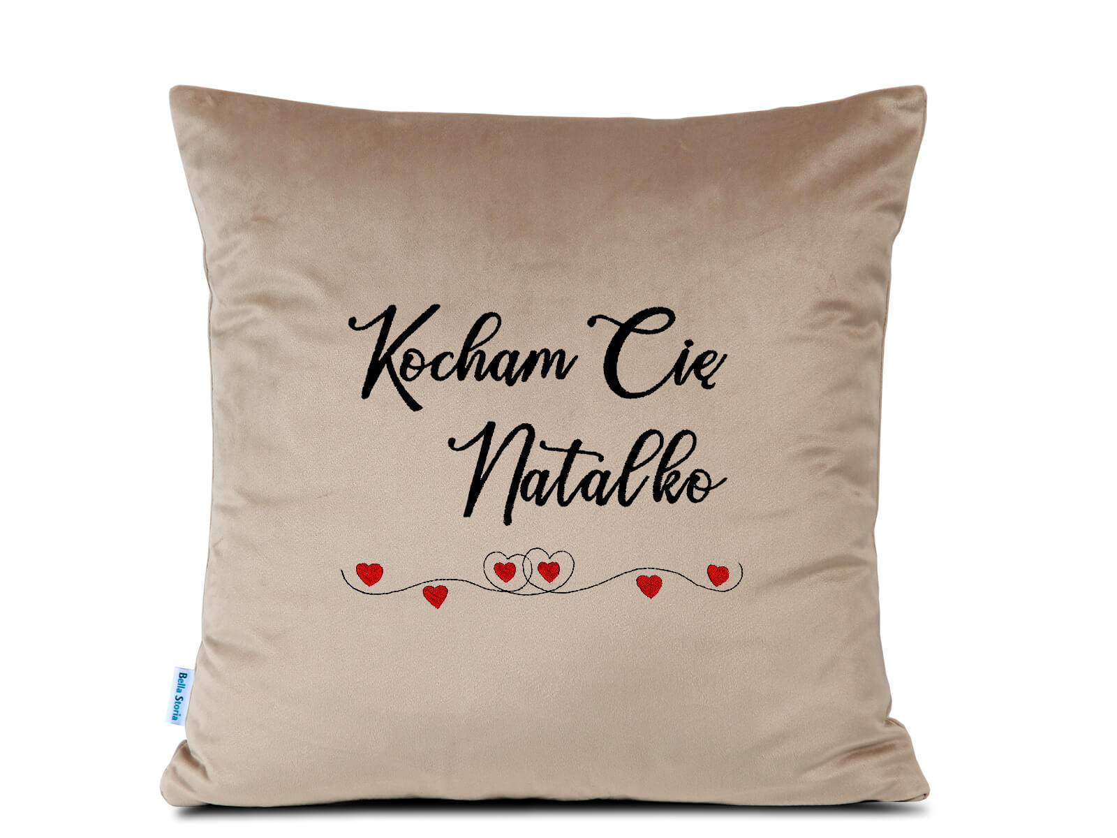Haftowana poduszka dekoracyjna z czarnym napisem "Kocham Cię" wraz z miejscem do wpisania imienia osoby obradowanej z dodatkowymi czerwonymi serduszkami. Wykonana została z subtelnej, miękkiej i delikatnej tkaniny welwetowej w kolorze beżowym.