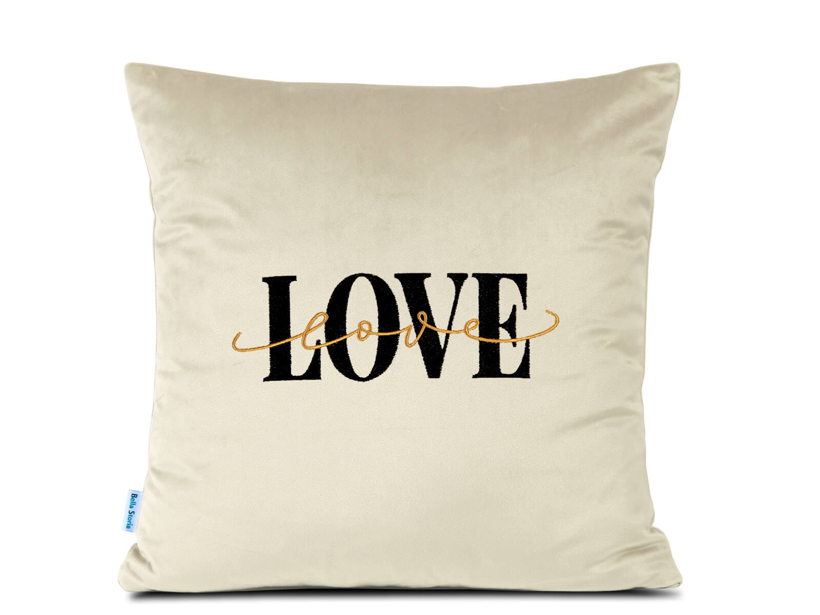 Haftowana poduszka dekoracyjna z czarnym dużym napisem LOVE oraz mniejszym w kolorze złotym. Wykonana została z subtelnej, miękkiej i delikatnej tkaniny welwetowej w kolorze kremowym.