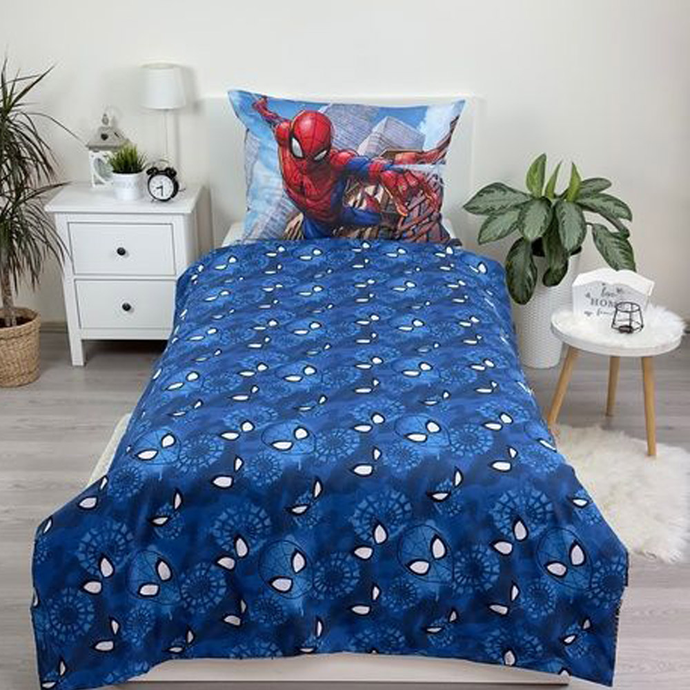 POŚCIEL 140x200 BAWEŁNIANA NIEBIESKA ZE SPIDER-MANEM W MIEŚCIE (MARVEL) – POSZEWKA 70x80