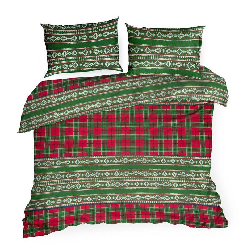 Pościel jest dwustronna — jedna strona prezentuje wzór w kratę, a druga powtarza motywy zimowe w harmonijnym układzie. Pozwala to na błyskawiczne odświeżenie wyglądu sypialni bez konieczności wymiany całego kompletu.