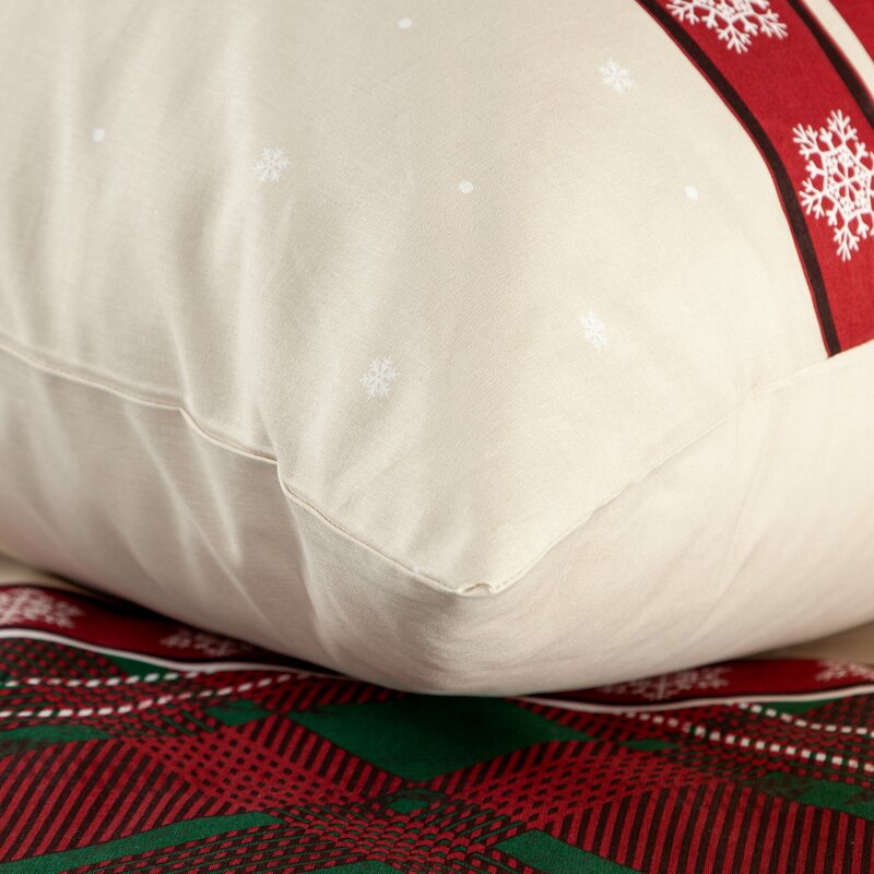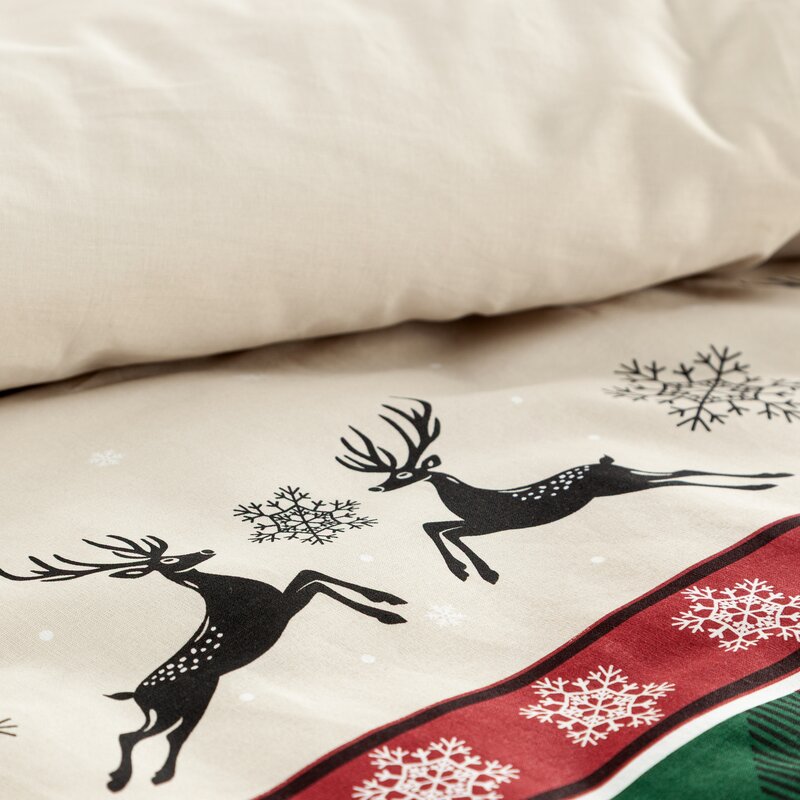 Górną część pościeli zdobią kremowe pasy z biegnącymi reniferami, otoczonymi drobnymi śnieżynkami – tworzy to elegancki, lekki i bardzo świąteczny akcent. Dół natomiast przyciąga wzrok klasyczną kratą w intensywnych odcieniach czerwieni i zieleni, idealnie wpisującą się w atmosferę Bożego Narodzenia. Całość jest spójna, harmonijna i świetnie komponuje się z tradycyjnymi zimowymi dekoracjami.
