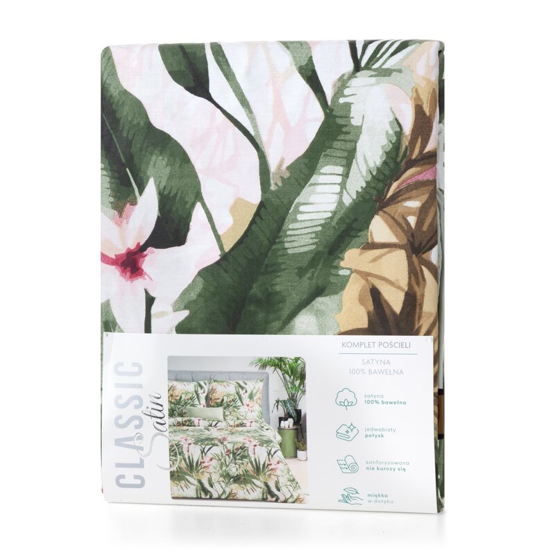 Komplet pościeli Spring w rozmiarze 160x200 cm został wykonany z wysokiej jakości satyny bawełnianej, którą wyróżnia miękkość, delikatny połysk, trwałość i łatwość prasowania, zdobionej wyjątkowym wzorem natury.