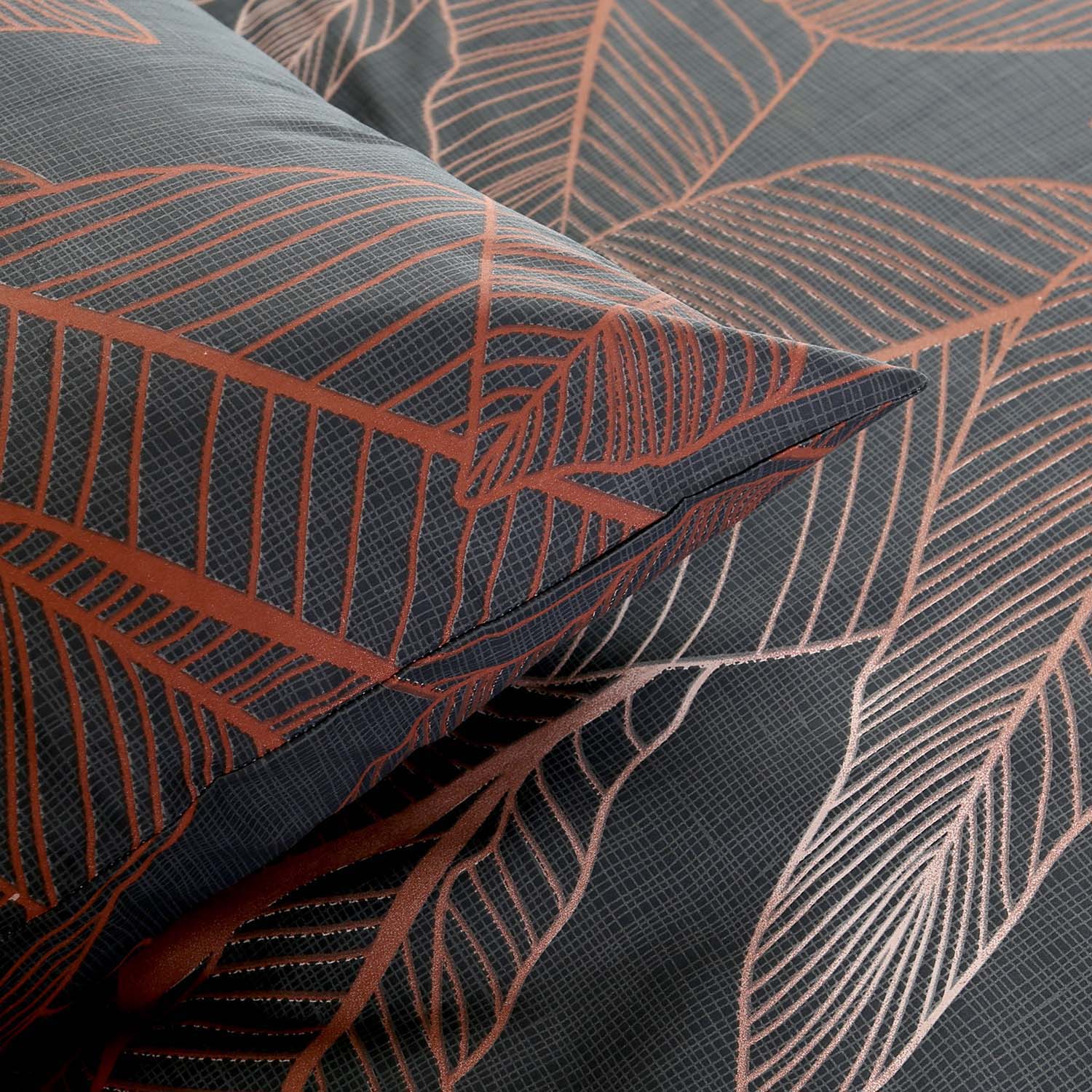Grafitowe tło z motywem jesiennych liści w naturalnych odcieniach brązu i miedzi wprowadza do wnętrza spokój i harmonię. Pościel Viletta (95) Jesienna Aura to idealne połączenie elegancji, funkcjonalności i subtelnej dekoracji, które sprawia, że sypialnia staje się przytulnym miejscem do relaksu w każdym sezonie.
