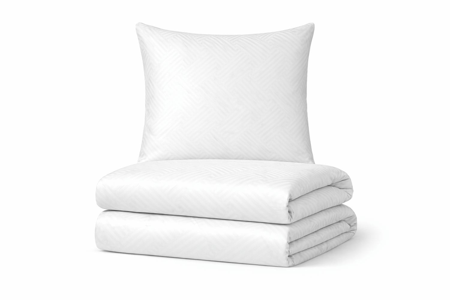 Hotelowa świeżość w śnieżnej bieli. Pościel 220x200 cm w bieli natychmiast rozświetla sypialnię i powiększa ją optycznie. Strukturalny wzór geometrycznych pasków w reliefie „ton w ton” zapobiega efektowi „płaskiej bieli”: łóżko zyskuje elegancję znaną z najlepszych hoteli. Satynowy blask nie jest intensywny – to raczej subtelne migotanie, które widać przy każdym ruchu tkaniny i w świetle lampki nocnej.