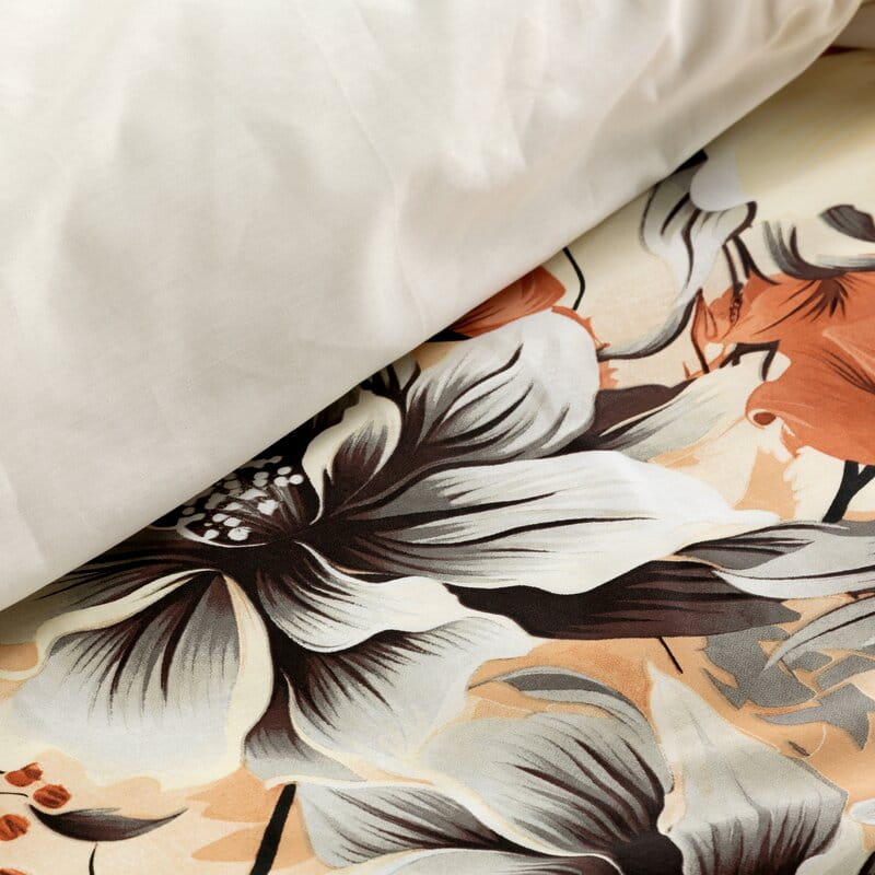 Proces sanforyzacji, któremu poddana jest tkanina sprawia, że tkanina nie kurczy się i jest trwała. Żywy, kontrastujący z jasnym tłem wzór znakomicie odświeża wnętrze sypialni. Nowoczesna technika barwienia digital print pozwala na uzyskanie niezwykle trwałych barw oraz sprawia, że intensywne i nasycone kolory nie blakną, nawet po wielu praniach.