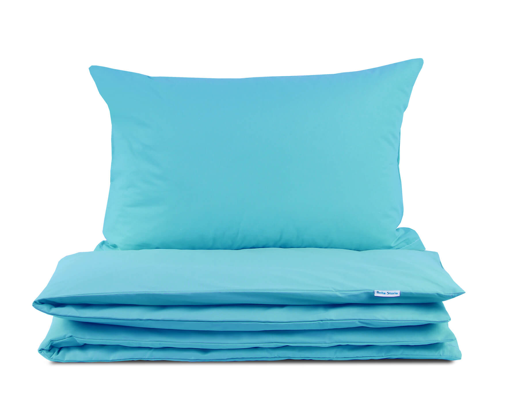Turkusowa pościel w rozmiarze 150x200 cm w komplecie z dwiema poszewkami 50x60 cm została przez nas uszyta w Polsce z certyfikowanych tkanin bawełnianych.