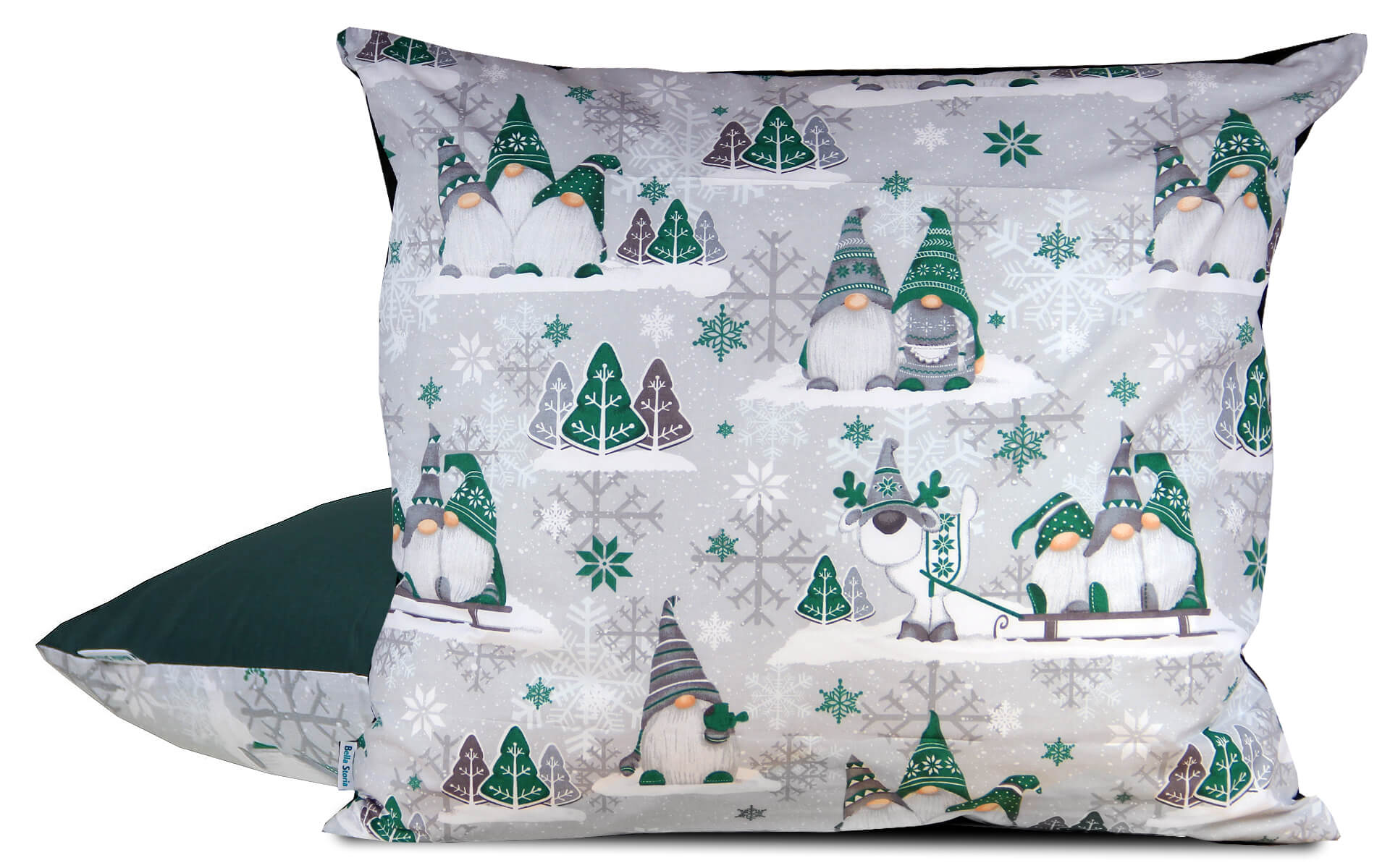 Poszewka Zielone Skrzaty w rozmiarze 70x80 cm to połączenie miękkości, stylu i świątecznego nastroju. Delikatny szary kolor tła oraz wesołe skrzaty w zielonych czapkach sprawiają, że wnętrze nabiera przytulnego charakteru. Dwustronny wzór umożliwia wybór między bajkowym motywem zimy a spokojną, gładką zielenią.