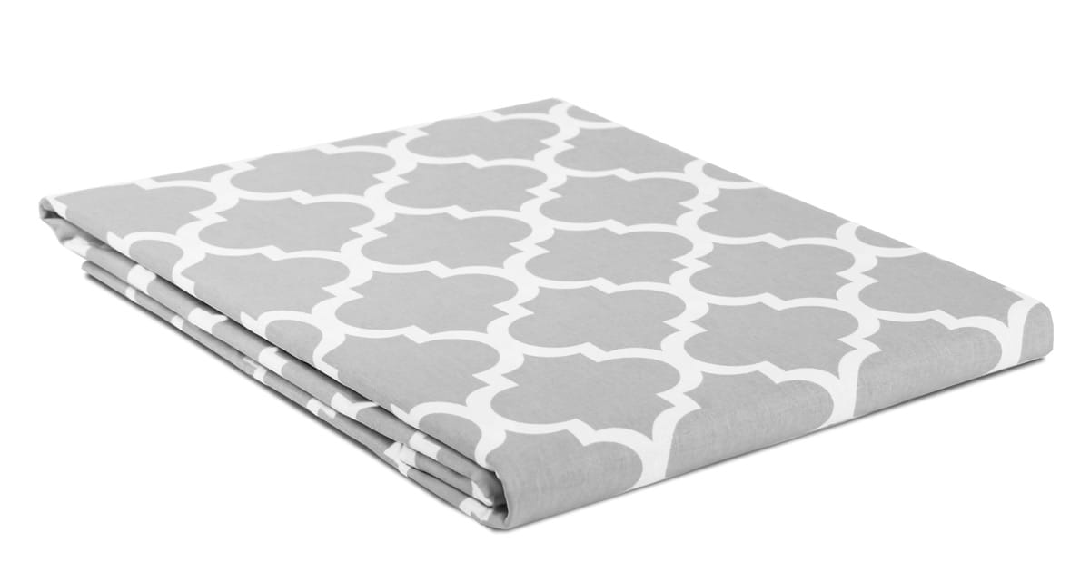 Miękkie i przyjemnie w dotyku szare prześcieradło we wzór marokańskiej koniczyny wykonane w 100% z bawełny. Pasuje na okrycie powierzchni spania narożnika, sofy oraz wersalki. Idealnie nadaje się do zastosowania w łóżkach hotelowych pojedynczych 80x200 cm, 90x200 cm lub 100x200 cm. Duży zapas materiału pozwala na założenie prześcieradła pod materac. Nasze prześcieradło z powodzeniem może służyć jako (półzaciemniająca) zasłona w oknie - do zawieszenia na żabkach. Wysokogatunkowa tkanina gwarantuje komfort użytkowania.