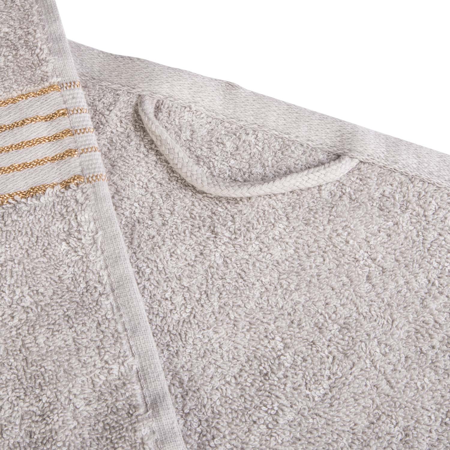 Kolor jasnopopielaty został uzupełniony subtelną bordiurą ze złotych nici, co nadaje całości wyjątkowo wyrafinowany charakter. To połączenie klasyki i elegancji, które pięknie prezentuje się w każdej łazience.